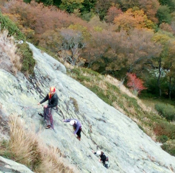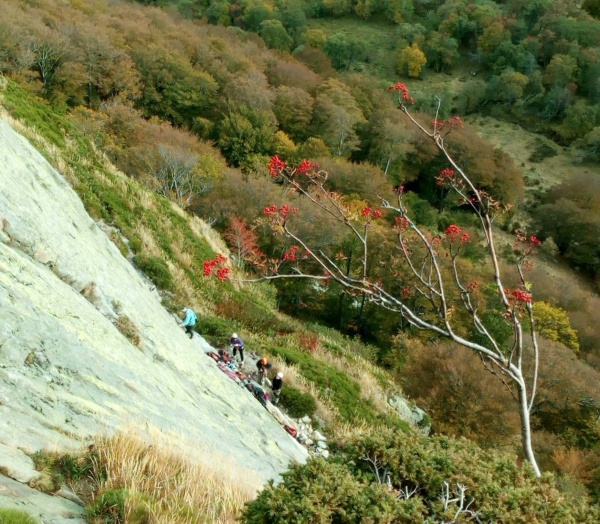 Formation des cordées, distribution des cordes, et la petite troupe bavarde rejoint, d’un pas décidé, le pied des voies, non sans avoir apprécié sur le parcours le tableau unique de la Dent de la Rancune et de la Crête de Coq. Un pâle soleil automnal éclaire la vallée et souligne la couleur des feuillages parés de leur nouvelle robe. Au fil de la journée, une petite brise se lève, un peu plus vivifiante au sommet des voies, un encouragement à accélérer les préparatifs du rappel.