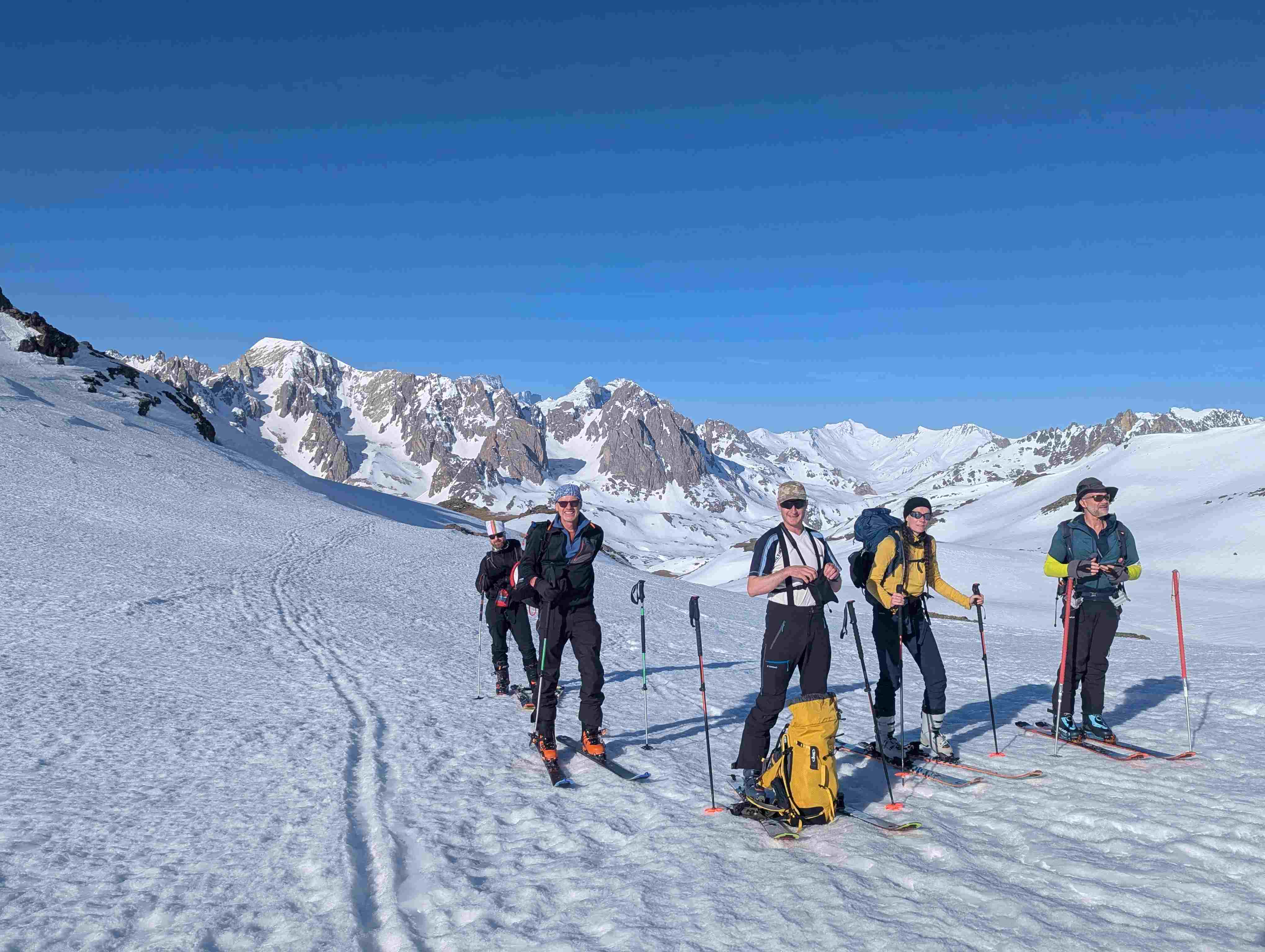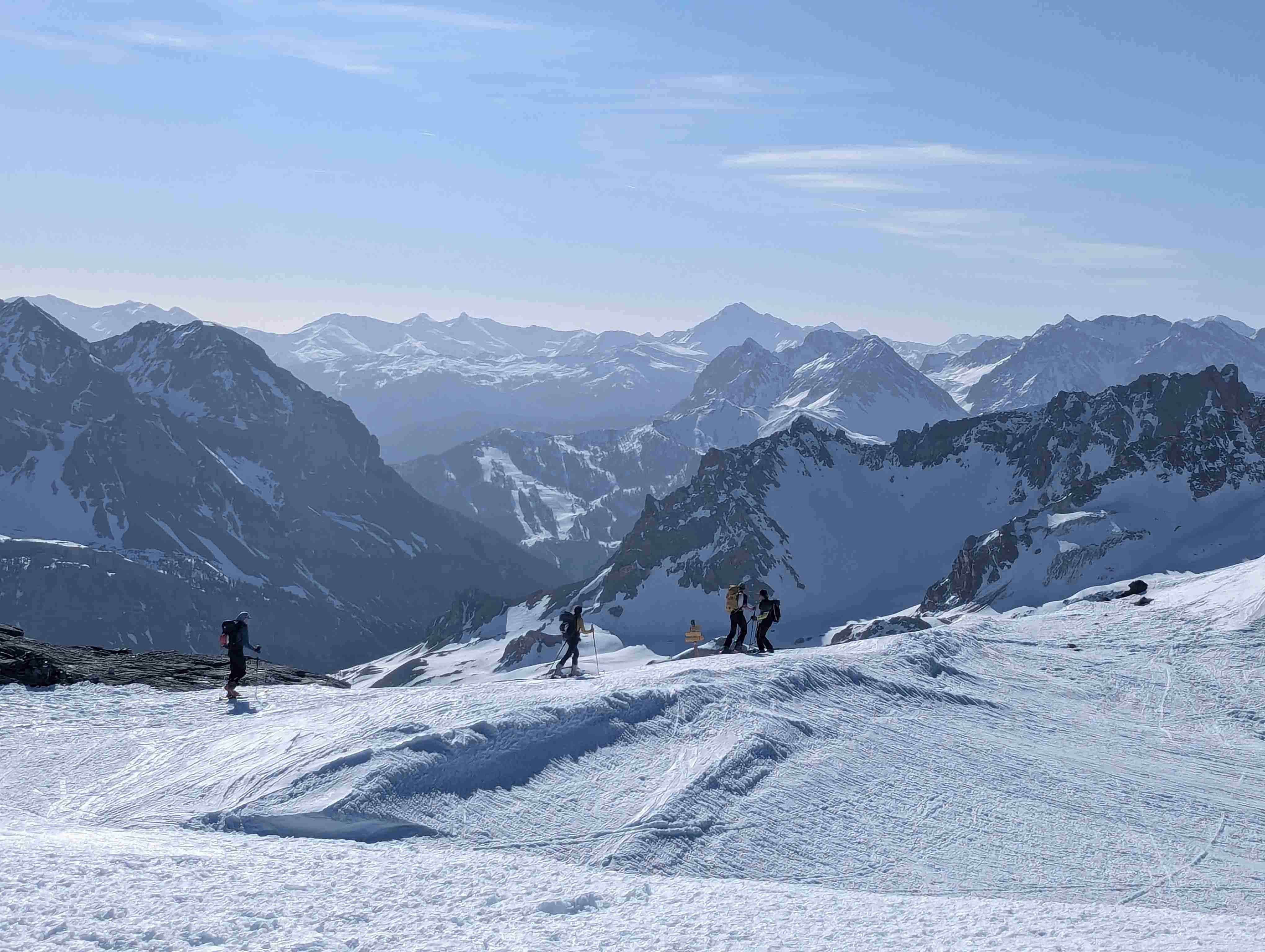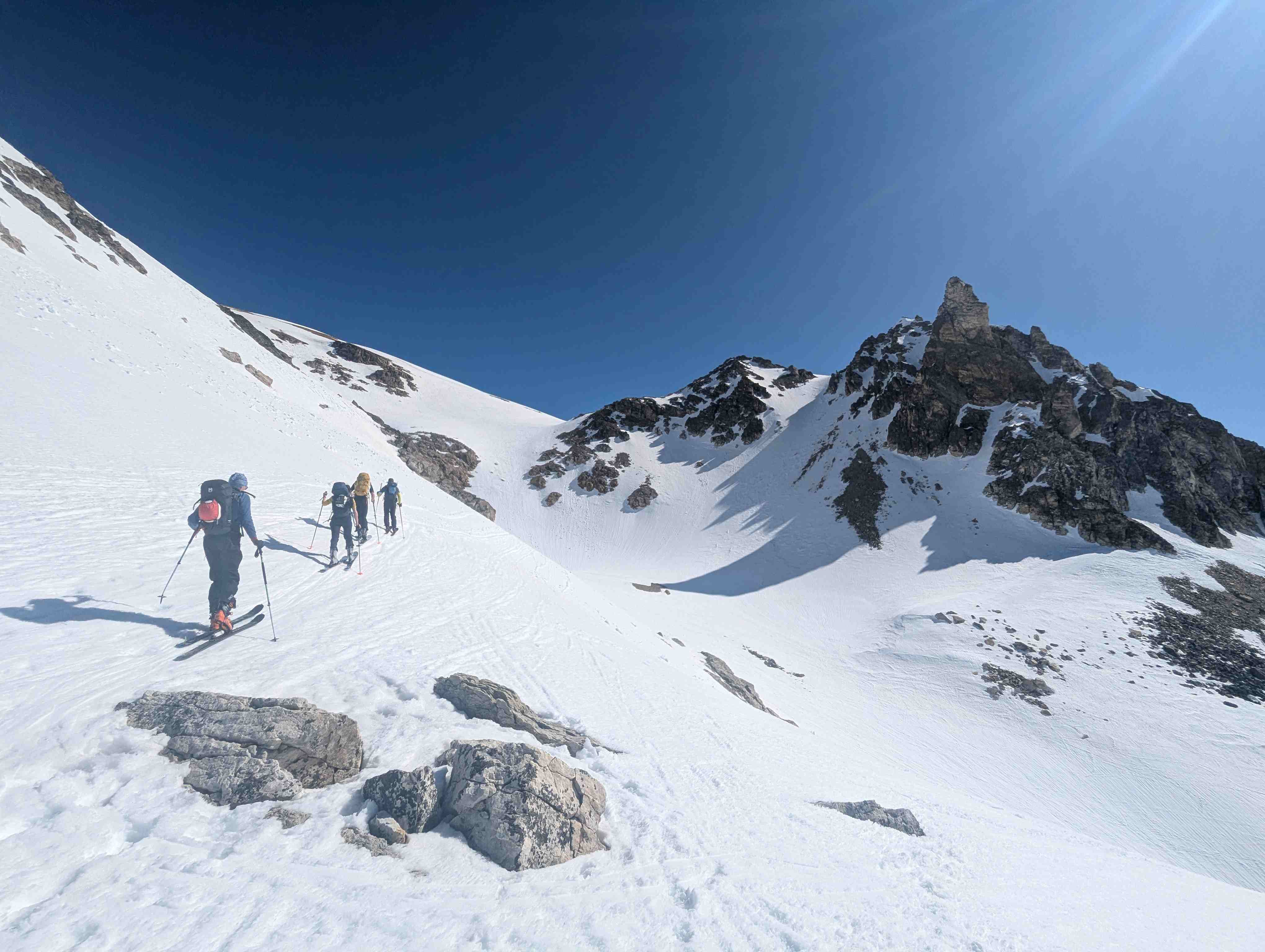 Arrivés au col des Muandes, nous descendons un peu pour contourner une zone de coulée récente avant de remonter par une longue traversée jusqu’à un col permettant l’accès au sommet du Thabor à 3 178 m. Un superbe belvédère d’où nous bénéficions d’un panorama à 360° sur les Alpes franco-italiennes.