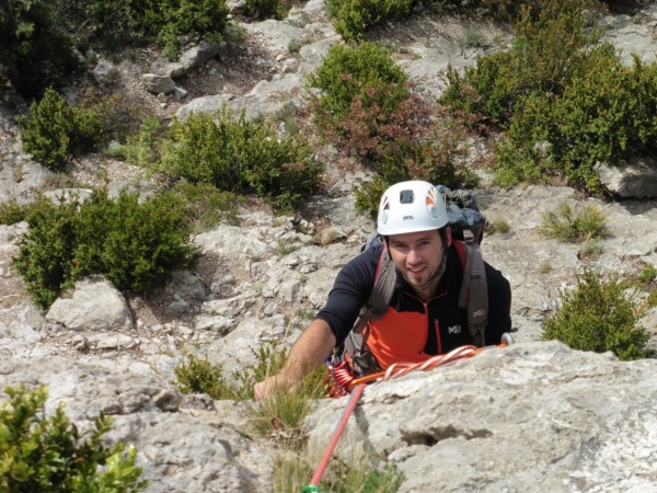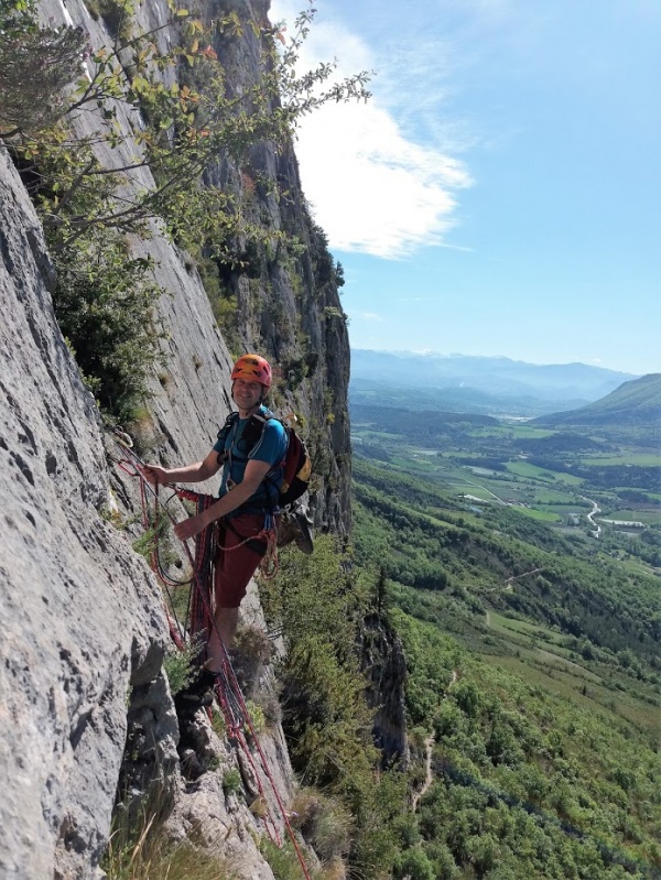 L'escalade a duré toute la matinée, et au fur et à mesure des longueurs, je suis passé par plusieurs sentiments très différents allant de « C'est beauuuuuu » à « Mais j'aurais jamais dû venir, c'est bien trop dur pour moi, tout ça ! », en passant par « Oh tiens, c'est quoi ça ? Ah... De la boue dans un trou... ». Les longueurs, toutes différentes, toutes aussi passionnantes les unes que les autres, l'alternance des moments d'effort et de contemplation, et finalement le sommet où je retrouvai Jean-Baptiste et les autres. L'ambivalence de mon sentiment à ce moment-là (quelque chose de l'ordre de « C'était difficile ! Mais c'était beau ! Mais difficile, mais beau, mais difficile mais beau... etc. ») n’a pu être interrompue que par une sensation bien plus forte et ancrée dans l'instant, du type : « J'ai super-faim ! ». Visiblement, je n'étais pas seul dans ce cas, et nous avons tous grignoté nos provisions, en haut de ce rocher, large de quelques mètres à peine, tout en regardant les vallées de chaque côté.