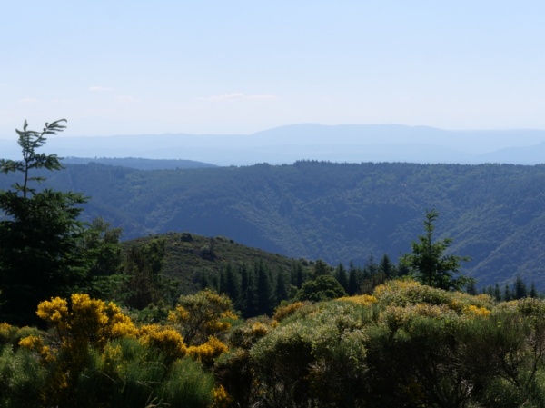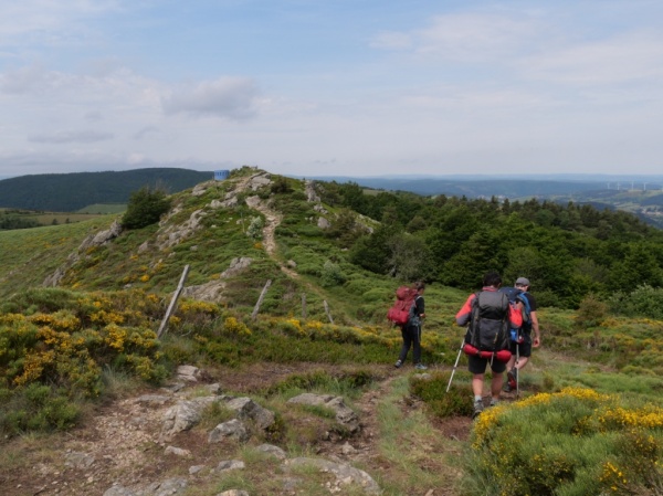 Le réveil du jour suivant a été humide ! Pas grave, on a tout rangé dans l'idée de mettre à sécher à la pause déjeuner. Le passage à Loubaresse a été décevant : l'auberge est fermée le samedi ! Le passage au col de Meyrand et la vue sur la vallée était splendide. Le parcours sur le massif du Tanargue et le sommet de Méjean plein de genêts en fleurs était fabuleux. Le soleil était de la partie ! Notre rencontre avec quatre cavaliers a été bien sympathique. Ils se rendaient, tout comme nous, à la Croix de Bauzon.