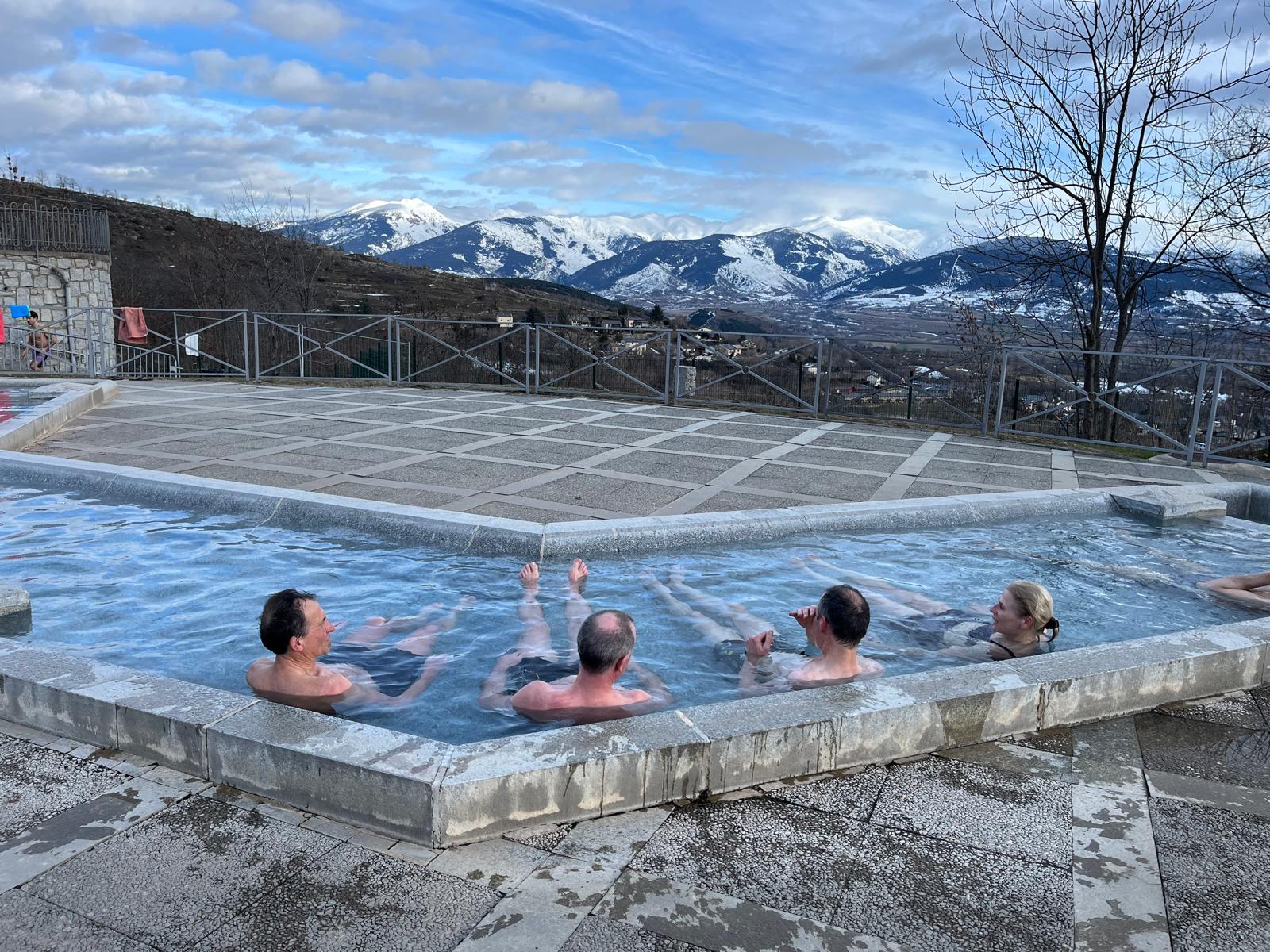 Lundi 9 février, nous partons de bonne heure, direction Font-Romeu, notre camp de base pour une semaine de raquettes dans les Pyrénées. La pause casse-croûte à Salses-le-Château nous permet d’en découvrir sa forteresse. Une fois pris possession de notre logement romeufontain, direction Dorres pour profiter des bains romains : l’eau à 40° C tranche avec le fond de l’air frais et la vue sur la chaîne pyrénéenne est superbe. Avant l’effort, le réconfort !