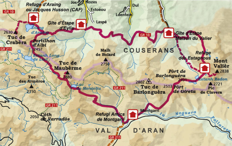 Une étape exigeante dans un environnement de paysages grandioses pour découvrir le massif du Valier.J5 mercredi 15 juillet, Refuge des Estagnous – La Maison du Valier, Distance : 9 à 12km., Dénivelé : +262m / -1522m., Signalisation : Chemin de la Liberté + GR 10, 936m-2452m